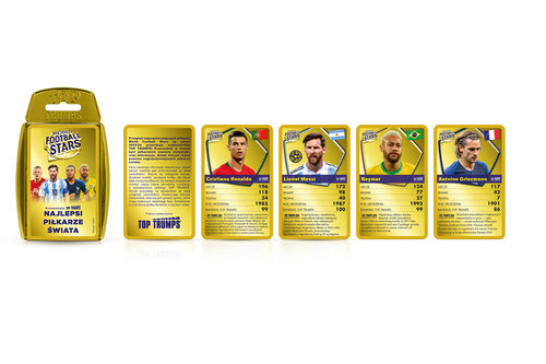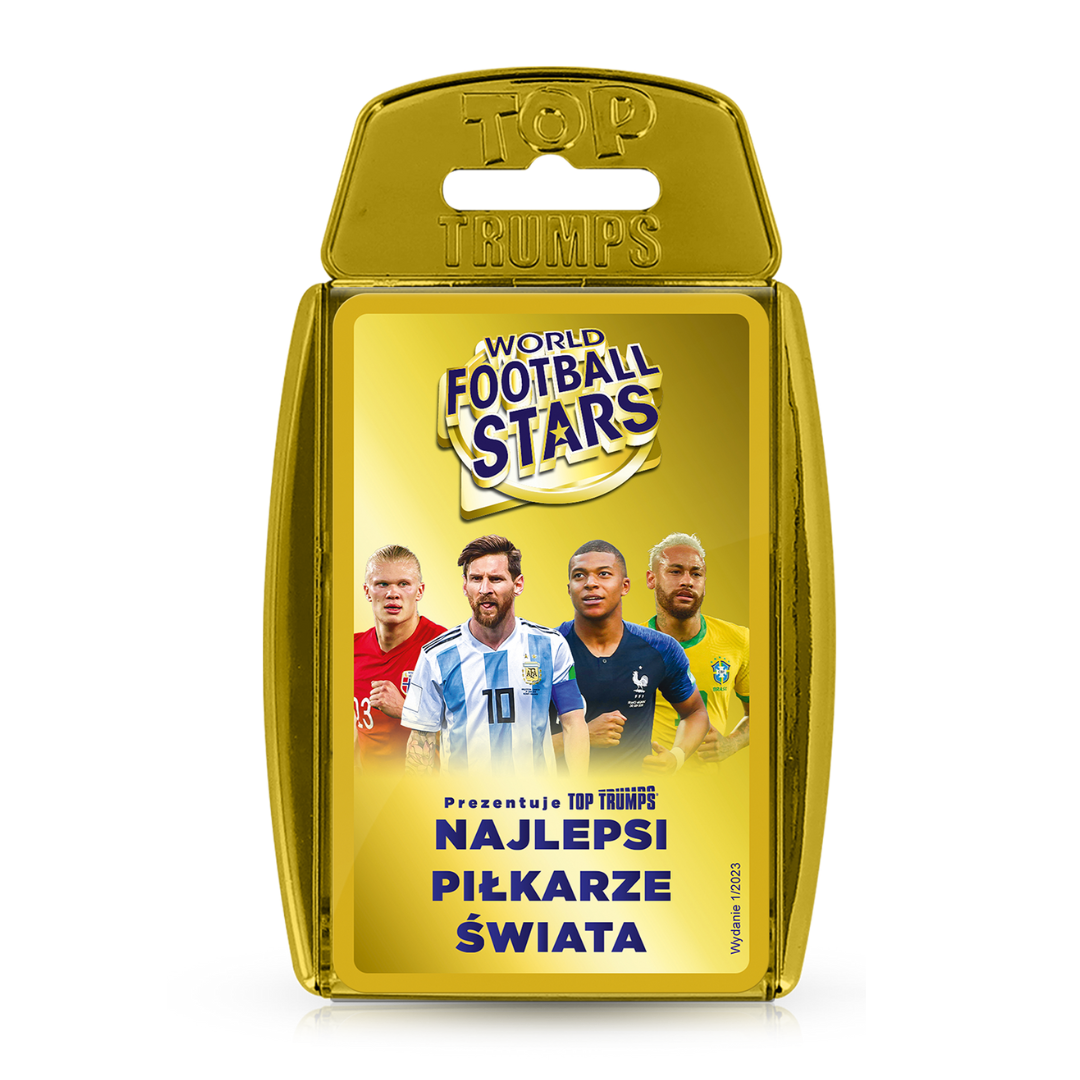 Opis produktuZasady bezpieczeństwaGra karciana Top Trumps World Football Stars. Gra Top Trumps to coś więcej niż karty! To znana od 50 lat na całym świecie rozgrywka, która zaangażuje każdego, bez względu na wiek i zainteresowania. Edycji kart Top Trumps powstały tysiące, od edycji miejskich po sportowe. W Polsce rekordy popularności bije edycja z bohaterami znanych wszystkim kreskówek takich jak Psi Patrol czy Super Zings. A już teraz dostępna jest wersja z idolami każdego fana piłki nożnej! Na każdej karcie znajdziemy innego piłkarza, znanego na arenie międzynarodowej oraz 5 atrybutów, które doprowadzą nas do zwycięstwa! Karty zawierają także ciekawostki. Talia umieszczona w zgrabnym, plastikowym pudełku może towarzyszyć nam w najdalszej wyprawie i umilić każdą podróż. Talię kart potasuj i rozdaj wszystkim graczom, którzy następnie muszą je trzymać rewersem do góry. Weź pierwszą kartę z wierzchu swojego stosu, odwróć ją i wybierz jeden z atrybutów. Reszta graczy również odwraca pierwszą kartę ze swoich stosów, podając swoje wartości przypisane do danej cechy, którą wybrałeś na początku. Jeśli miałeś najwyższą liczbę punktów, wygrywasz swoją turę i zabierasz karty przeciwników umieszczając je na spodzie swojego stosu. Zostaniesz zwycięzcą, jeśli zdobędziesz wszystkie karty rywali! Zawartość gry Top Trumps World Football Stars: