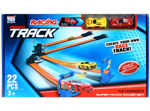 Zestaw składa się z 22 elementów. W zestawie znajdują się dwa samohodziki. Całość wykonana z plastiku. Długość toru jazdy: 120cali. Zabawka przeznaczona dla dzieci w wieku: 3+.