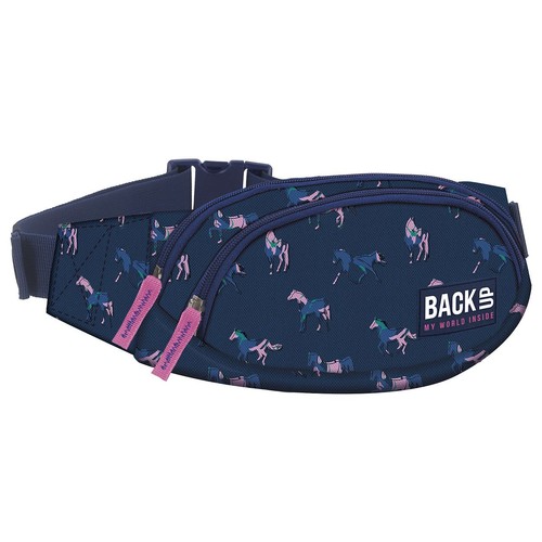 Torba na biodra BackUP model A 17 gdzie intensywne, granatowe tło ozdobione zostało motywami różowo-niebieskich koni, które pokochają nastolatki.