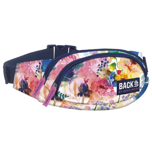 Torba na biodra BackUP model A 28 w nasycone kolorami, akwarelowe kwiaty przywodzące na myśl romantyczną, wiosenną łąkę, wykończony granatowymi zamkami, które dopełniają całości.