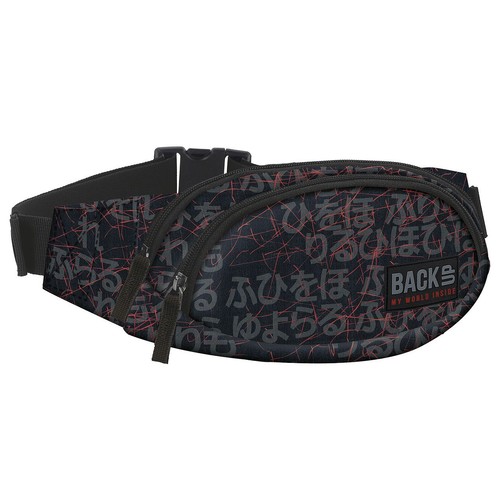Torba na biodra BackUP model A 47 czarne tło, japońskie litery w szarym kolorze i czerwone rysy, wzór jednocześnie spokojny, ale z niewątpliwą nutką szaleństwa, którą podkręcają czerwone dodatki.