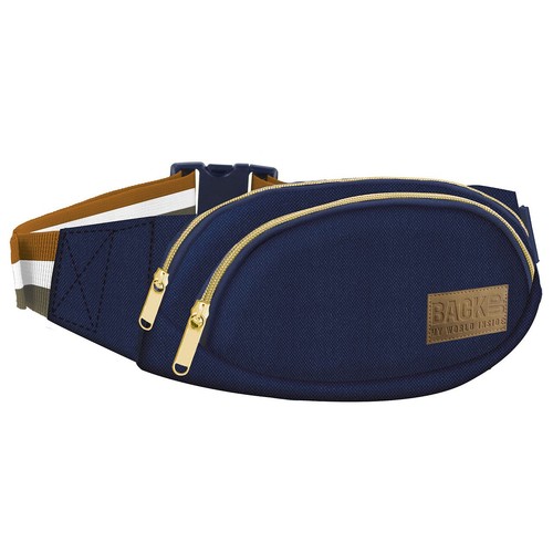 Torba wykonana z płótna bawełnianego w kolorze granatowym z najmodniejszym paskiem w paseczki w odcieniach szarości, bieli i złotego brązu wykończona złotymi zamkami.