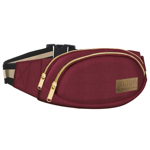 Torba wykonana z płótna bawełnianego przez co zyskuje zupełnie nowy wielkomiejski charakter i nutkę elegancji w kolorze bordowym z beżowo-czarnym paskiem i złotymi zamkami.