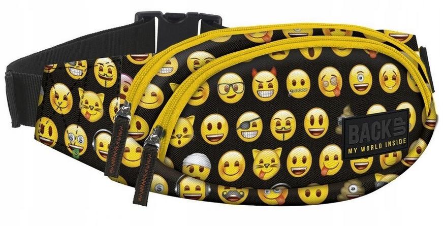 Torba na biodra BackUP model A EMOJI 86 w motyw z żółtymi buźkami Emoji na czarnym tle. Uwielbiamy je wszyscy za to, że wprawiają nas w optymistyczny nastrój. Wystarczy na nie spojrzeć i już mamy dobry humor.