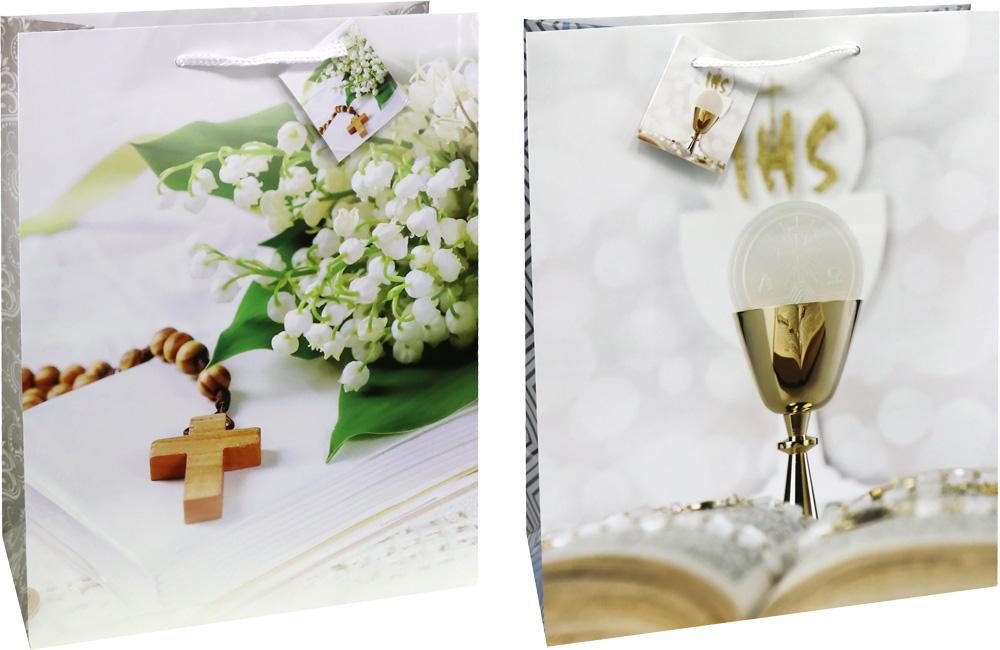 Elegancka torebka prezentowa w klasycznym wzorze komunijnym nawiązującym do przyjęcia najważniejszego sakramentu kościelnego. Wymiary 26 x 32,4 x 12,7 cm