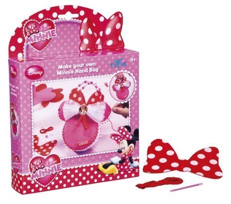 Uszyj własną torebeczkę.Zawartość: materiałowe części torebeczki, emblematy z myszką, plastikowa igła, nitki, wstążki,-koraliki, siateczka, instrukcja