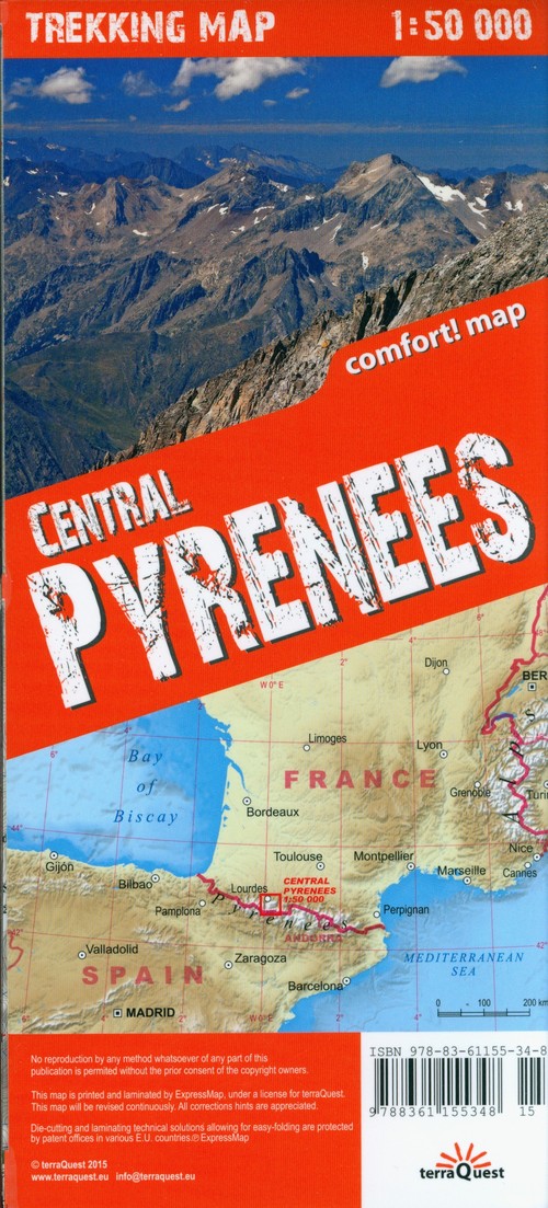 Pirenejelaminowana mapa trekkingowaDoskonała i komfortowa w użytkowaniu mapa trekkingowa środkowych Pirenejów powstała specjalnie z myślą o osobach aktywnych, kochających wędrówki i wspinaczkę. Obejmuje swym zasięgiem tereny od Lourdes na północy po granicę francusko-hiszpańską na południu oraz obszar od masywu Balatous na zachodzie po tunel Aragnouet-Bielsa na wschodzie.Publikacja została wykonana w systemie Comfort! Map firmy ExpressMap (P) i pokryta jest laminatem, co pozwala na dłuższe i wygodniejsze jej użytkowanie nawet w najtrudniejszych warunkach atmosferycznych panujących na szlakach. Zawiera legendę w sześciu językach: angielskim, niemieckim, francuskim, hiszpańskim, włoskim oraz polskim.Mapę charakteryzuje:bogata treść turystyczna, m.in.: trasy trekkingów, infrastruktura turystyczna, atrakcje przyrodnicze i inne interesujące obiekty,cieniowanie plastycznie pokazujące ukształtowanie terenu,zgodność z GPS współrzędne geograficzne w układzie WGS-84,trwałość i wygoda użytkowania.Publikacja jest częścią wielokrotnie nagradzanej serii map trekkingowych wydawnictwa terraQuest, która zdobyła zaufanie wielu amatorów wypraw trekkingowych w wielu krajach Europy i poza nią.