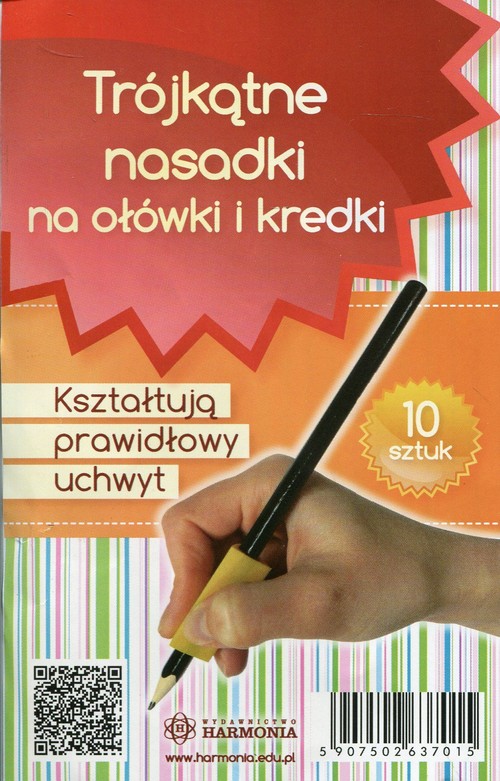 NASADKI TRÓJKĄTNE NA OŁÓWKI I KREDKI korygujące nieprawidłowy uchwyt (10 sztuk)Kolorowe nasadki o średnicy 7 mm i 6 mm przeznaczone są dla dzieci zarówno praworęcznych, jak i leworęcznych, które nieprawidłowo trzymają ołówek, kredkę czy długopis. Nasadki pomagają nie tylko wykształcić nawyk prawidłowego trzymania narzędzia graficznego, ale także kontrolować siłę jego nacisku.