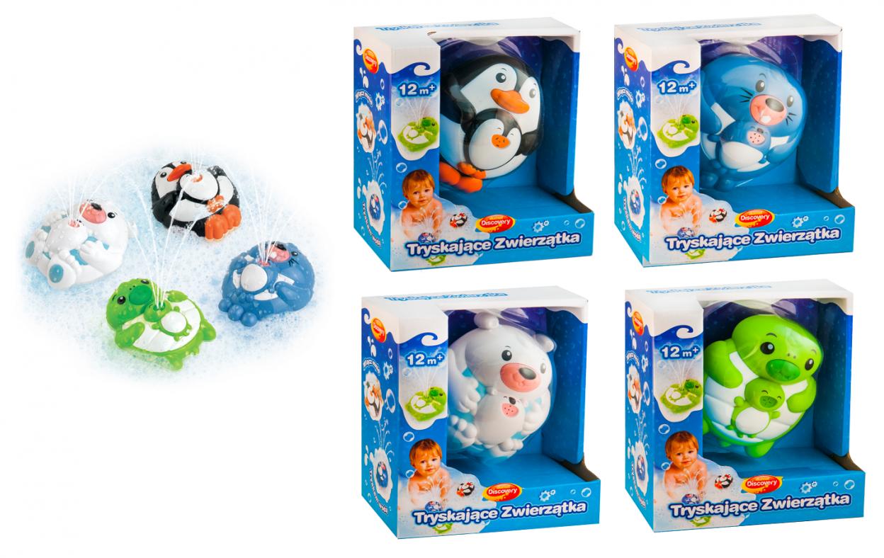 Tryskające zwierzątko to prawdziwa zabawa podczas kąpieli. Wystarczy położyć zwierzątko na powierzchni wody i nacisnąć na jego pyszczek, żeby zaczęło tryskać nieprzerwanym strumieniem wody. Zabawka występuje w czterech różnych wersjach: Pingwin, Żółw, Niedźwiedź Polarny, Foka.
