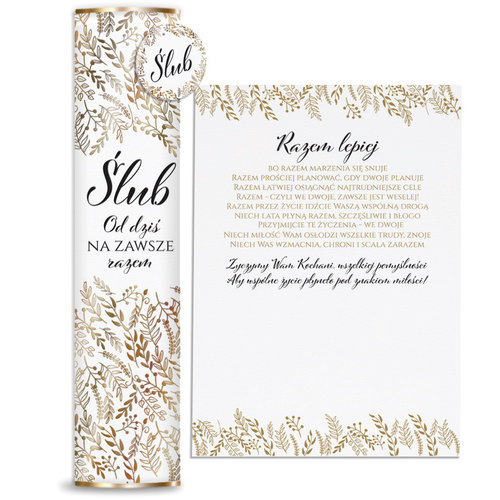 Tuba ŚLUBNA, wysokośćh 25cm,średnica 5 cm.Bogato złocona, zamykana stalowymi złotymi wieczkami. W komplecie kartka z życzeniami A4 z obwolutą i bilecikiem. Całość zapakowana w worek foliowy z wstążką i przywieszką.