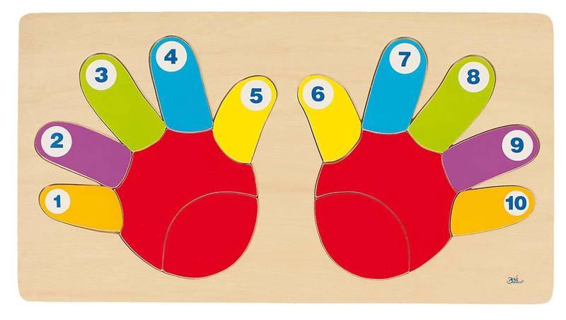 Układanki dłonie, składające się z 7 elementów każda, pomagają w nauce liczenia i nazywania kolorów.