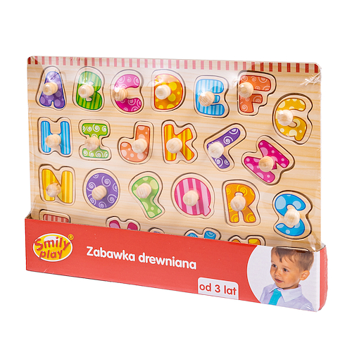 Drewniana układanka Literki to kolorowe puzzle, które pomogą dziecku poznać kształt literek oraz zapamiętać ich kolejność w alfabecie. W drewnianej tablicy wycięto otwory o kształcie kolejnych znaków alfabetu. Litery należy dopasować do odpowiednich otworów. Pomagają w tym doczepione do puzzli uchwyty. Dziecko umieszczając daną literkę w miejscu, do którego ona pasuje, uczy się równocześnie rozpoznawania i dopasowywania kształtów, a także zapamiętuje kolejność liter. znakomita nauka poprzez zabawę! dodatkowo do każdej literki dopasowane jest angielskie słowo zaczynające się na tą literkę oraz odpowiednia ilustracja. Drewniane Cyferki i Liczydło wspiera: o Rozwój koordynacji wzrokowo - ruchowej o Małą motorykę o Rozwój koncentracji i pamięci wzrokowej o Naukę alfabetu x