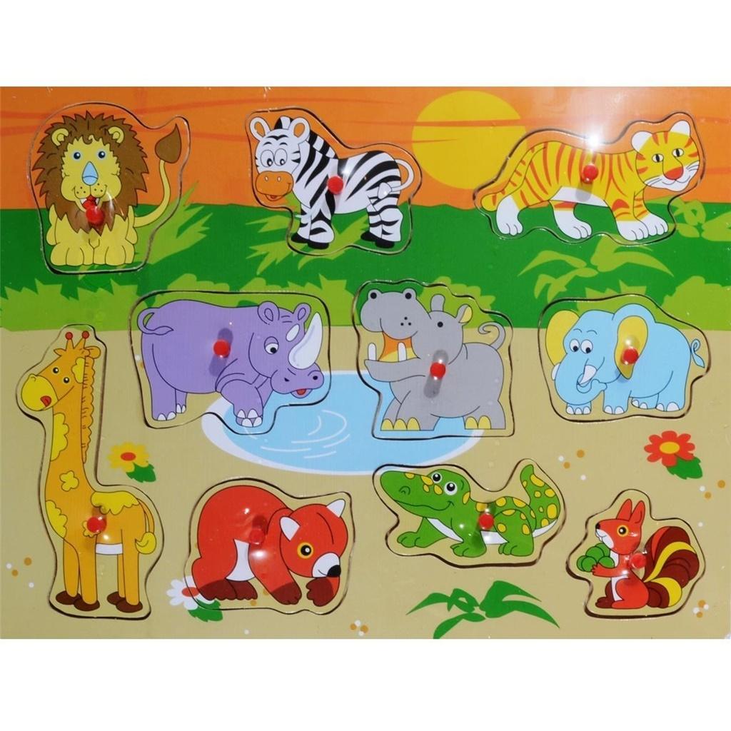 Drewniane puzzle z uchwytami - dzikie zwierzęta. Elementy można wyjąć z układanki i ponownie dopasować w odpowiednie otwory w drewnianej ramce.