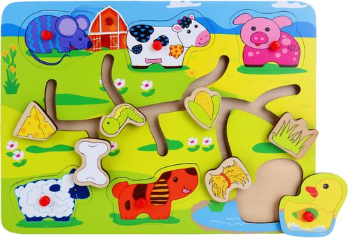 Plansza tej zabawki zawiera 6 elementów – puzzle z pinezkami przedstawiające wesołe wiejskie zwierzątka, które należy dopasować po kształcie do odpowiednich miejsc na planszy. Każdy element posiada przymocowaną pinezkę ułatwiającą wygodne wyjmowanie i wkładanie puzzli.