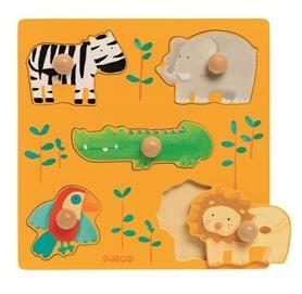 Drewniane puzzle Zwierzaki to drewniane puzzle kształtowe dla najmłodszych dzieci. Zadaniem dziecka jest dopasowanie danego zwierzątka do właściwego kształtu. Uchwyty na każdym klocku sprawiają, ze małym rączkom niezwykle łatwo je układać. Drewniane puzzle z uchwytem- zwierzęta z dżungli. walory edukacyjne:rozwój zręczności manulanej,spostrzegawczości ,rozpoznawanie kształtów, zwierzątek wiek dziecka :12 miesięcy +