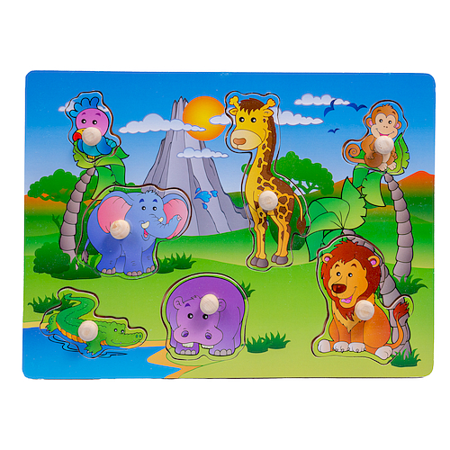 Drewniana układanka puzzle uchwyty z wizerunkiem zwierzątek z zoo. Rozwija w dzieciach spostrzegawczość oraz wyobraźnię.