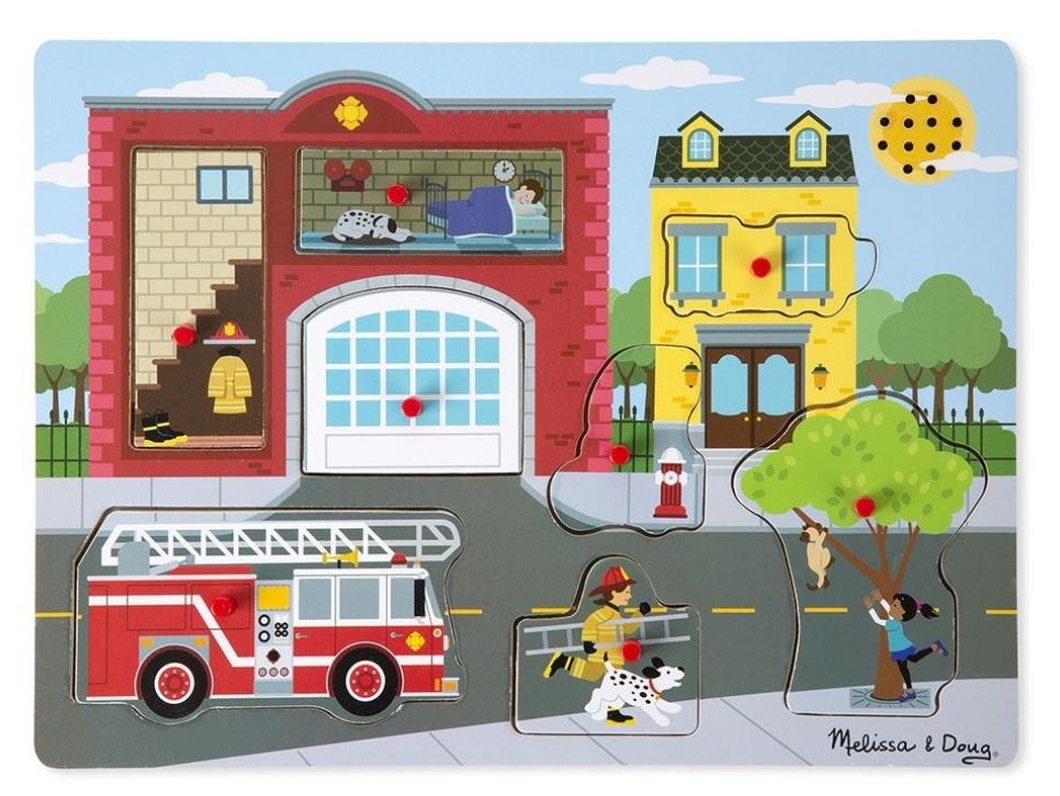 Straż Pożarna w akcji – układanka dźwiękowa. Dopasuj kształty aby usłyszeć dźwięki jakie można usłyszeć w remizie. Co robią strażacy? Komu pomogą? Ułóż elementy by się przekonać.