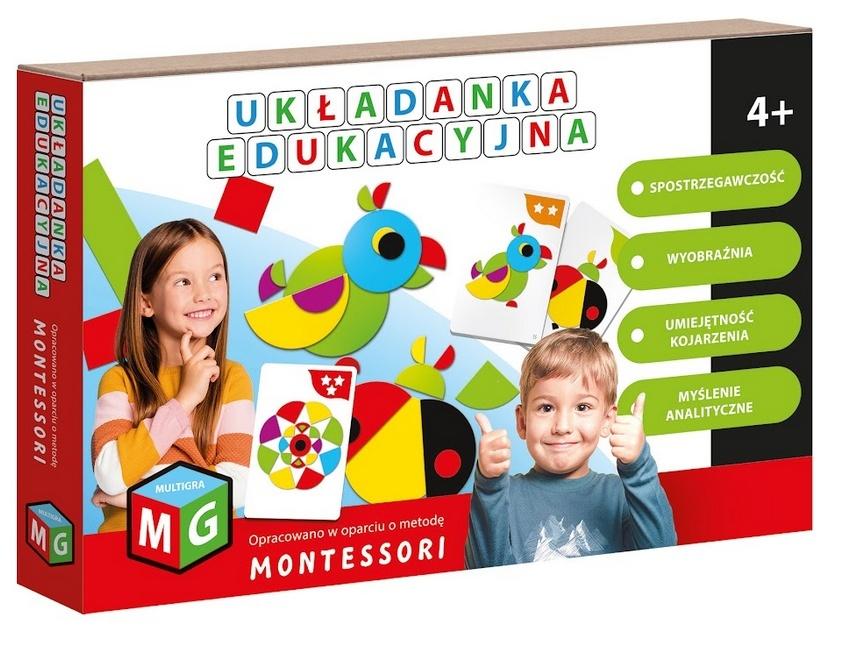 Nauka, kreatywność i radość odkrywania wszystko w jednej zabawce! Układanka Montessori od MultiGry to edukacyjna przygoda, która pobudza wyobraźnię i uczy logicznego myślenia! Dzięki niej dziecko nie tylko ćwiczy motorykę małą, ale także rozwija zmysł kompozycji, proporcji i planowania, co doskonale wpływa na jego przyszłe umiejętności matematyczne i artystyczne. Zestaw zawiera 72 kolorowe elementy i ponad 50 propozycji wzorów do ułożenia. Karty zostały oznaczone poziomem trudności, aby dziecko zaczęło zabawę od prostych kształtów. Dzięki temu rozwinie swoje zdolności manualne i kompozycyjne, co w konsekwencji pozwoli mu na tworzenie własnych autorskich kształtów. Układanka Edukacyjna od MultiGry stworzona została zgodnie z filozofią Montessori. Dziecko uczy się przez działanie dopasowuje elementy, tworzy wzory i rozwija wyobraźnię. Układanka wspiera samodzielność, koncentrację i logiczne myślenie, angażując zmysły i ćwicząc motorykę małą. Zawartość opakowania: Tekturowe elementy geometryczne 72 szt. Dwustronne karty z wzorami 27 szt. Instrukcja x