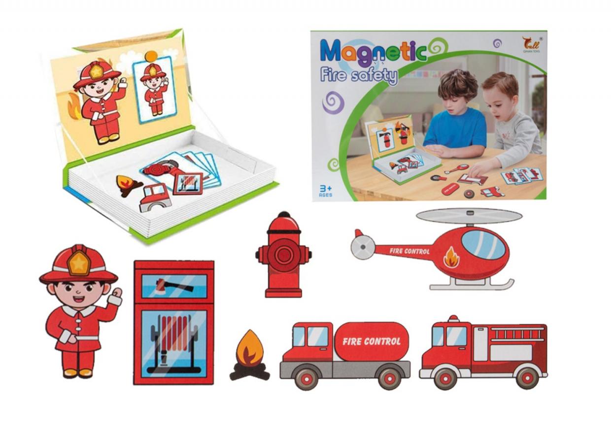 W zestawie 31 elementów - magnetyczne elementy wyposażenia strażaka, pojazdy straży pożarnej, 8 obrazków.