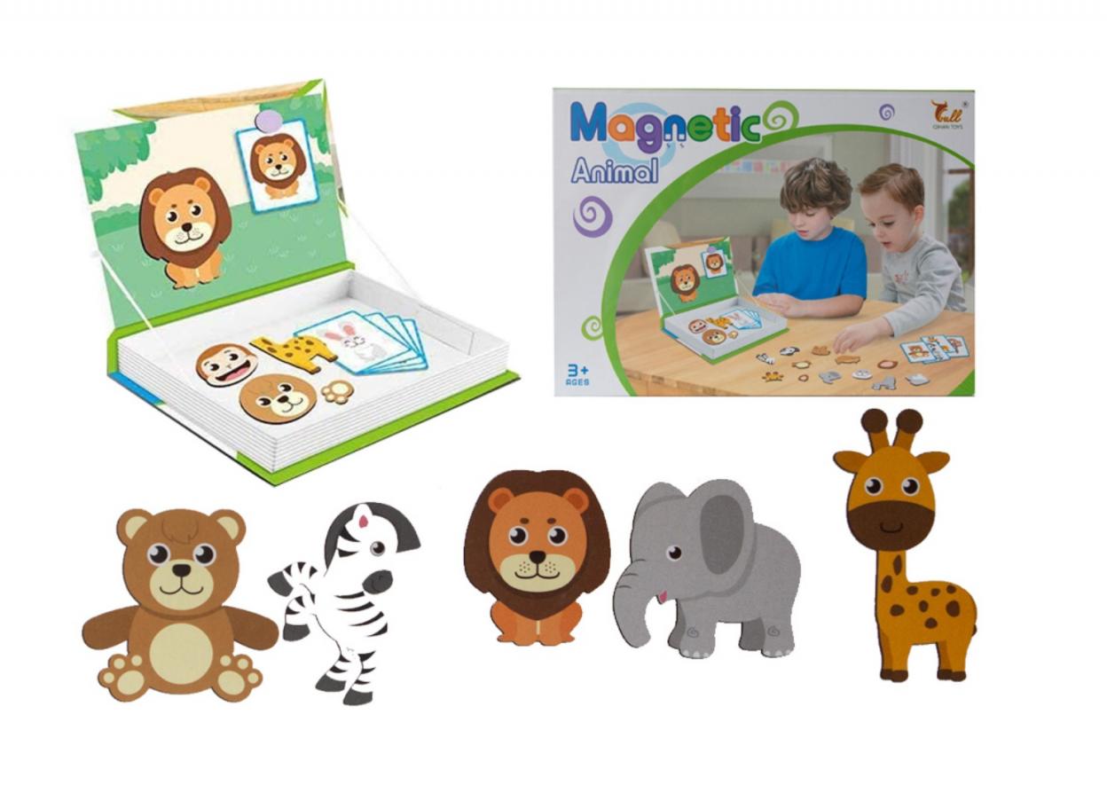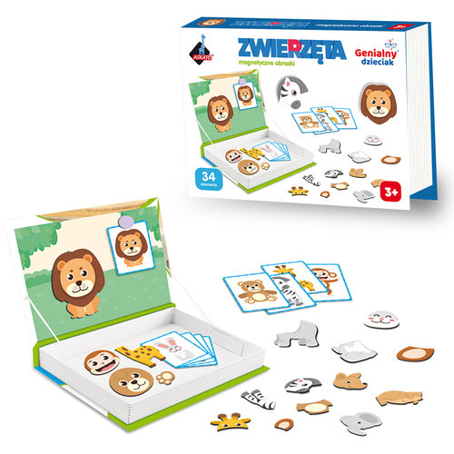 Puzzle magnetyczne - ZWIERZĘTAW zestawie 34 elementy - magnetyczne elementy zwierzątek, 8 obrazków. Dziecko może układać na załączonej planszy różne zwierzątka, tworzyć obrazki z załączonych elementów ciała poszczególnych zwierząt, a także uczyć się ich nazw. Wiek: 3+ Wymiary opakowania: 26.5x4x19 cm