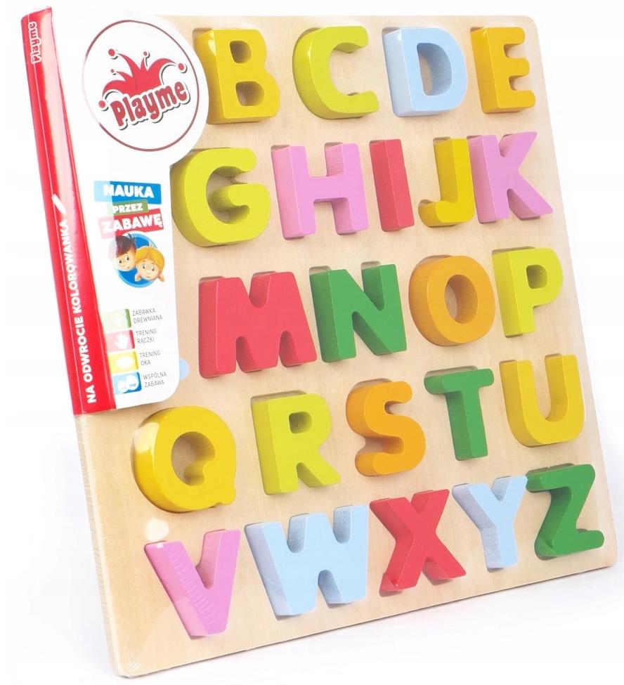 Zabawka ta jest pomocna w pierwszych etapach nauki czytania, pomaga też w rozwoju intelektualnym pociechy. Układanka składa się z drewnianej podkładki, 26 kolorowych liter 3D od A do Z.