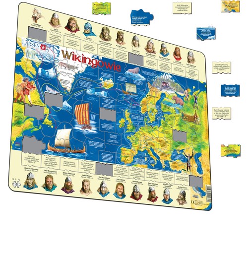 Popłyń statkiem przez Europę i dowiedz się wszystkiego o Wikingach. Czy będziesz walczyć w Szwecji, czy nawiążesz relacje z rdzennymi Amerykanami? Ta ilustrowana łamigłówka zawiera fakty na temat „Epoki Wikingów”. Dowiesz się o skrawku historii dziejącej się między VIII a XI wiekiem. W tym okresie Wikingowie terroryzowali i najeżdżali zarówno Europę, jak i Rosję. W górnej i dolnej części układanki znajdziesz 21 osób, które wywarły różne wpływy w tym okresie, a także zdobędziesz skrótową wiedzę o słynnych Wikingach i wydarzeniach historycznych. Produkt zachęca do zapamiętania faktów o tych postaciach historycznych. Środkowa część układanki składa się z mapy Morza Śródziemnego, Norweskiego, Północnego, Grenlandzkiego i Oceanu Atlantyckiego. Wiele elementów zawiera informacje o konkretnych wydarzeniach w określonym czasie. Kolorowe linie biegnące przez układankę pokazują trasy przemieszczania się Wikingów w poszukiwaniu nowych miejsc do osiedlenia się, zaś biały kontur wyraźnie pokazuje szlaki handlowe. Ta układanka zawiera 102 elementy i jest przeznaczona dla starszych dzieci mających ochotę zdobyć podstawową wiedzę o Epoce Wikingów.