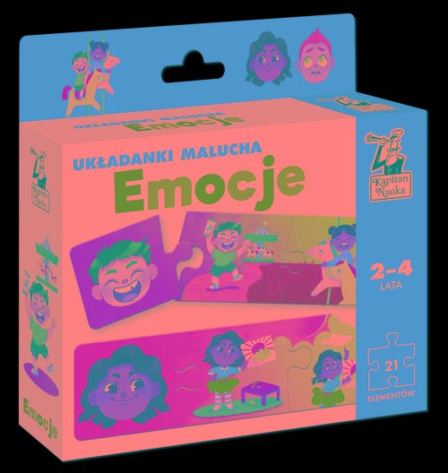 „Układam i poznaję Emocje” (2–4 lata) to układanki, które wspierają dzieci w rozpoznawaniu i nazywaniu emocji oraz poszukiwaniu strategii radzenia sobie z uczuciami, zarówno tymi przyjemnymi, jak i powodującymi dyskomfort. Proste scenki prezentujące sytuacje, z którymi często mierzą się przedszkolaki, pokazują, w jaki sposób można przeżywać emocje i zaopiekować się nimi, gdy uczucia biorą górę. Podczas zabawy układankami nie tylko dopasowujemy obrazki, tak aby tworzyły logiczną całość, lecz również rozmawiamy o sytuacjach i towarzyszących im emocjach. Z układankami można rozwijać wyobraźnię emocjonalną, a także ćwiczyć spostrzegawczość i motorykę małą. Rozwijanie umiejętności społeczno-emocjonalnych i komunikacyjnych Puzzle „Układam i poznaję Emocje” wspierają rozwój emocjonalny i intelektualny poprzez zabawę. Przedstawiają siedem scenek związanych m.in. z radością z wygranego biletu, dumy z własnego obrazka, strachu przed pająkiem czy smutku z powodu rozstania z bliską osobą, a także przykładowe sposoby radzenia sobie z uczuciami, np. dzielenie się smutkiem i radością z innymi czy mierzenie się ze strachem z pomocą opiekuna. Dziecko ma okazję przyjrzeć się emocjom, które malują się na twarzy osób i ujawniają w sposobie zachowania, a także obserwować reakcje innych osób. Przy okazji uczy się empatii oraz opowiadania o emocjach. Kolorowe, przykuwające wzrok ilustracje Justyny Karaszewskiej angażują uwagę dzieci i zachęcają do zabawy. Puzzle zostały wykonane z grubej tektury, co gwarantuje bezpieczną zabawę oraz wytrzymałość nawet podczas wielokrotnego układania scenek. Rozwój rozwój mowy, wyobraźnia, spostrzegawczość, motoryka mała Ilustratorka Justyna Karaszewska – ilustratorka książek i gier planszowych dla dzieci i dorosłych, projektantka postaci oraz grafik do gier wideo. Miłośniczka kotów, żab i czekolady z miętą. W serii również Układam i poznaję Zawody (2–4 lata)