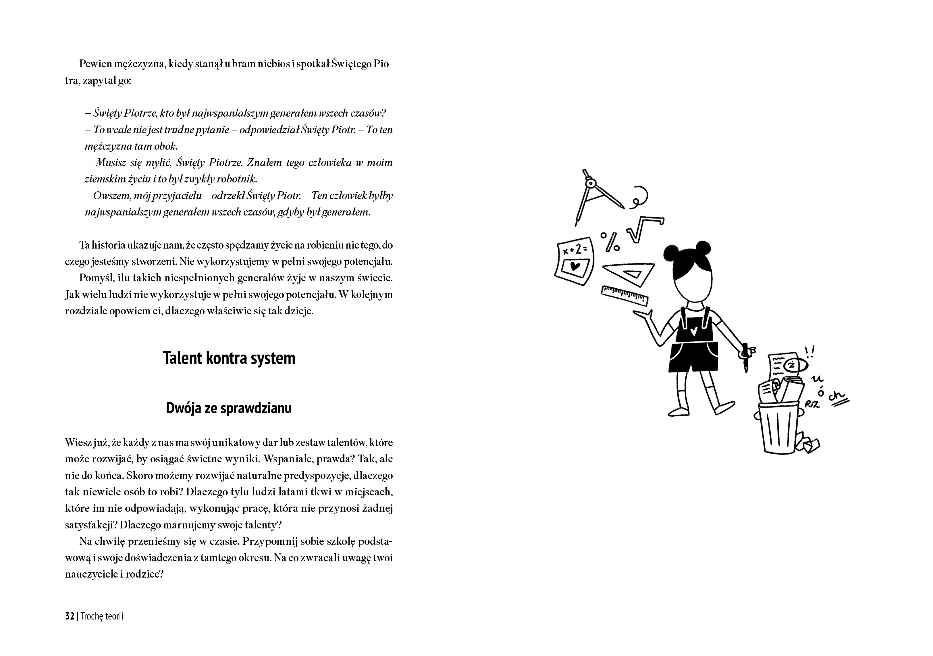 Klucz do sukcesu jest dużo prostszy: odkryj swoje naturalne talenty i spraw, by stały się twoją supermocą! Zmień życie zawodowe, zacznij lepiej zarabiać i znajdź pasję, która przyniesie ci radość. Uwielbiasz ludzi i łatwo nawiązujesz nowe znajomości? Potrafisz zrobić świetną prezentację nawet bez przygotowania? Każdy twój dzień jest zaplanowany od A do Z? A może wręcz przeciwnie, najlepiej wychodzi ci improwizacja? Czy wiesz, że właśnie w tym może objawiać się twój talent? Przestań robić to, co wychodzi ci tak sobie, i nie deprecjonuj tego, co przychodzi z łatwością przekuj to w mocną stronę. Ta książka to najlepszy autocoaching, jaki możesz sobie sprawić! Znajdziesz tu: sposoby na odkrycie talentów, ćwiczenia, które przeprowadzą cię przez ten proces, praktyczne porady, jak przekuć talenty w mocne strony, inspirujące historie ludzi, którzy odmienili swoje życie. Nie trać ani chwili, bo właśnie teraz jest najlepszy moment na zmianę! Z opinii o autorce: Praca z Malwiną to kruszenie swoich słabości i odważne realizowanie celów. Krok po kroku, delikatnie, ale równocześnie bardzo konkretnie zadaje pytania sięgające sedna, których sama bym sobie nie zadała. [] Dodatkowo jako kobieta doskonale rozumie jak ważne jest pogodzenie bycia matką i spełnioną zawodowo kobietą. Danuta Grzywacz Jestem pod wrażeniem profesjonalizmu Malwiny, jej wiedzy i doświadczenia. Miałam przyjemność skorzystać z konsultacji u niej i polecam je każdemu, kto chce odkryć swoje talenty i dobrze zrozumieć swoje mocne strony. Joanna Ceplin Bardzo się cieszę, że mam możliwość współpracy z Malwiną. Jest niezwykle kompetentną, rzetelną, pomysłową, pełną pozytywnej energii i pasji osobą, która chętnie dzieli się wiedzą i doświadczeniem oraz inspiruje do działania. Karol Ciszak Dzięki Malwinie [] uświadomiłam sobie potęgę własnego potencjału. To potencjał godny mitologicznej bogini. Każdy z nas go ma. Monika Michalik Szczerze polecam współpracę z Malwiną, która jest osobą ciepłą, zaangażowaną, ale przede wszystkim w 100% profesjonalną. Wspólnie pracujemy nad moimi talentami, co realnie pozwala mi sięgać po więcej. Ewa Przeździecka Malwina Faliszewska certyfikowana coachka mocnych stron Instytutu Gallupa oraz International Coaching Federation, ekspertka w obszarze Diversity & Inclusion, mentorka wspierająca w świadomym rozwoju kariery i budowaniu pewności siebie. W 2018 roku wystapiła na konferencji TEDx Warsaw Women. Prowadzi popularny podcast Siegaj po wiecej. Jej misja jest osmielanie kobiet do tego, by w pełni wykorzystywały własny potencjał i osiagały sukcesy na miare swoich niezwykłych mozliwosci. Powyższy opis pochodzi od wydawcy. x