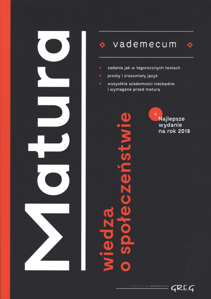 Vademecum Matura - wiedza o społeczeństwie Wydawnictwa GREG stanowi doskonałą pomoc zarówno dla osób decydujących się wybrać „WOS” jako przedmiot maturalny, jak dla uczniów pierwszej klasy liceum, chcących szybko powtórzyć materiał lub przygotować się do klasówki czy odpowiedzi.