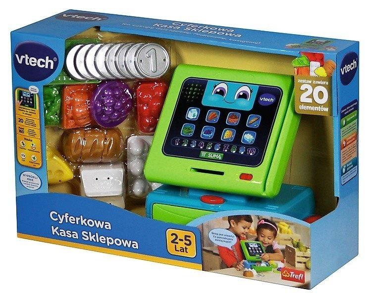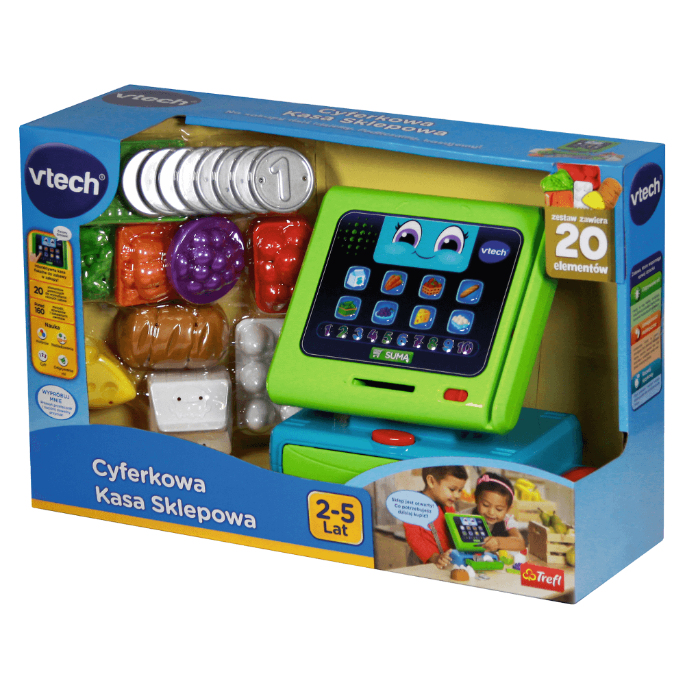Posiada 20 elementów, które uczą poprzez zabawę: monety, banknoty oraz imitacje artykułów spożywczych