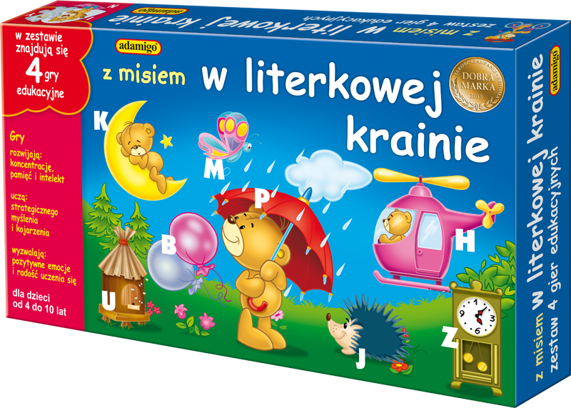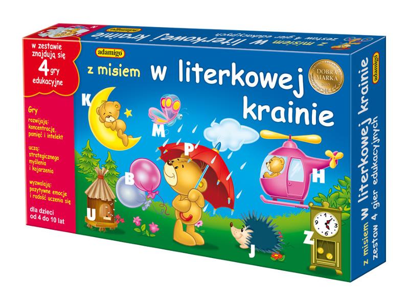 Dzięki grze „Z misiem w literowej krainie” Twoje dziecko wyruszy w ekscytującą podróż do magicznej krainy literek. Gra skonstruowana jest tak, aby dzieci poznały kształt liter drukowanych i potrafiły je skojarzyć z odpowiadającymi im nazwami przedmiotów. Atutem gry jest jej wielowariantowość, dzięki czemu zaciekawi ona dzieci w różnym wieku.