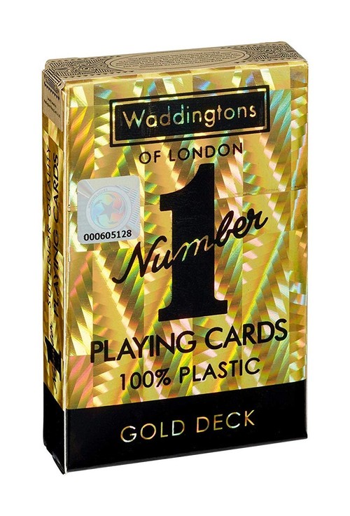 Karty Waddingtons No. 1 Gold 100% Plastik Klasyczna talia 55 kart dystrybuowana przez firmę Winning Moves. Ta rodzinna talia kart umili niejedno popołudnie i niejeden wieczór w gronie przyjaciół. Najwyższa jakość SUPERIOR QUALITY - gwarantowana przez brytyjską markę Waddingtons, obecną na rynku od 1905 roku.