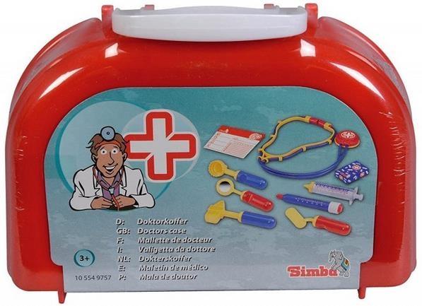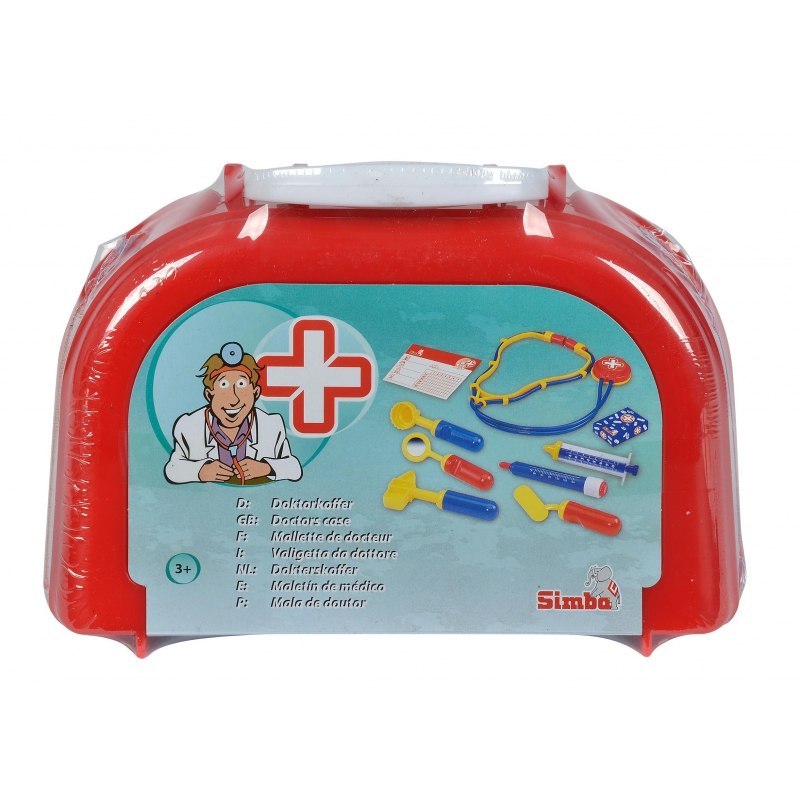 Mini walizeczka lekarska z ośmioma akcesoriami, m.in. stetoskop, termometr, strzykawka.