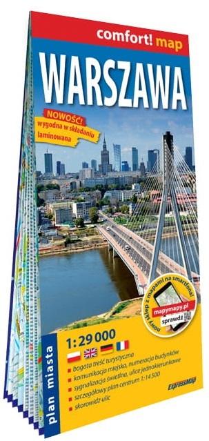 Pomogą w tym: szczegółowy rysunek zabudowy wraz z numeracją budynków wzdłuż ulic i na osiedlach, linie metra, linie autobusowe i tramwajowe wraz z przystankami, linie Szybkiej Kolei Miejskiej (SKM) i Warszawskiej Kolei Dojazdowej (WKD), sygnalizacja świetlna, ulice jednokierunkowe, parkingi, stacje benzynowe, bogata treść turystyczna, m.in.: parki narodowe i krajobrazowe, rezerwaty przyrody, tramwaj wodny, zabytki, muzea, hotele, schroniska młodzieżowe i inne istotne obiekty, budynki użyteczności publicznej, centra handlowe, szczegółowy plan centrum w skali 1:14 500 (1 cm 145 m), skorowidz ulic. x