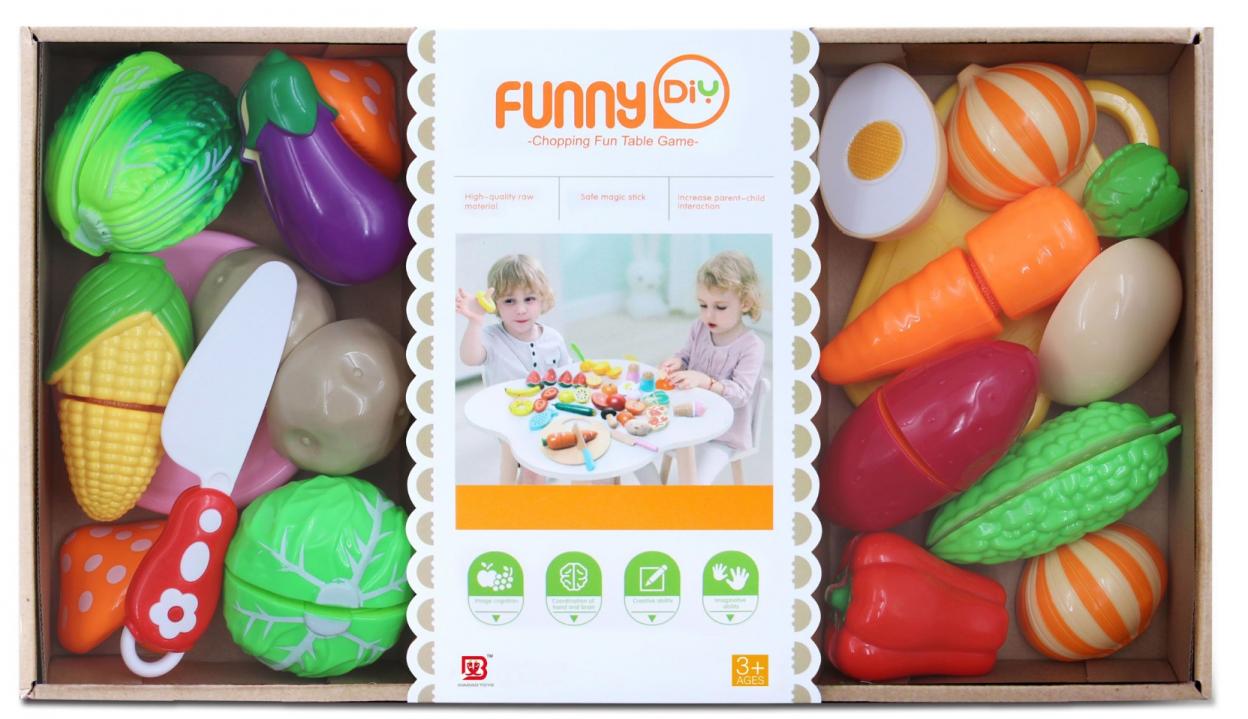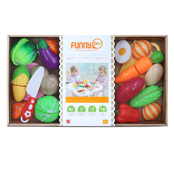 Zestaw zawiera deskę do krojenia, nóż, warzywa i owoce w dwóch częsciach łączonych rzepem.