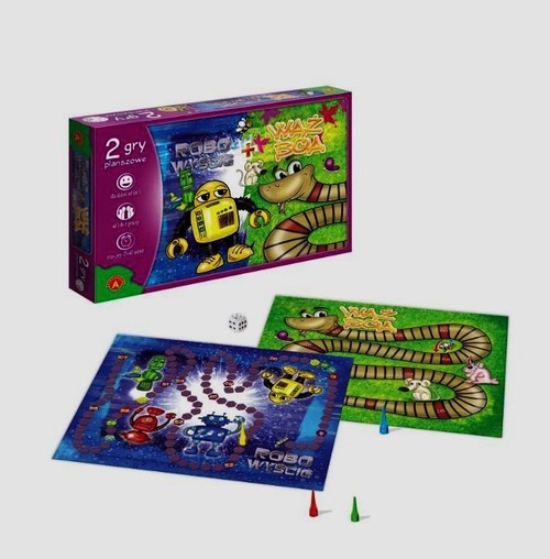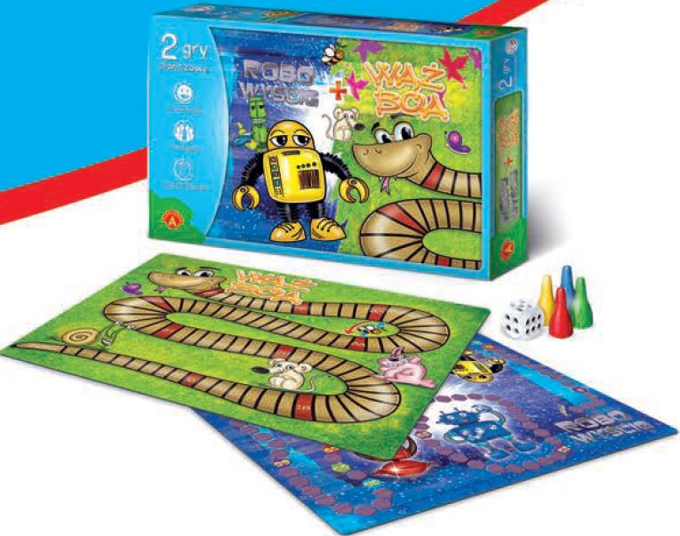 Zawartość pudełka: dwustronna plansza, 4 pionki, kostka do gry, instrukcja.
