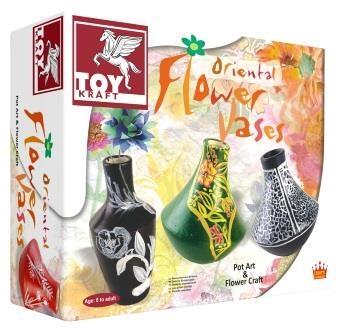 Zestaw zawiera: 3 ceramiczne wazoniki, farby akrylowe, farby temperowe, pędzelek, bibułki, papierowe łodyżki, instrukcję.
