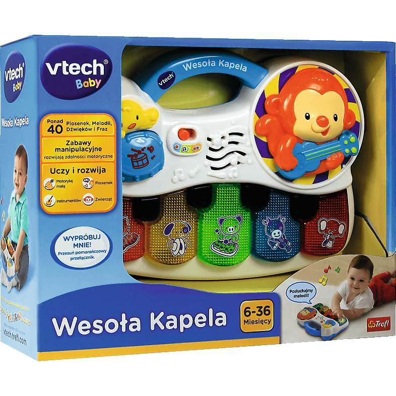 Posiada 5 kolorowych, podświetlanych klawiszy. Na każdym z nich znajduje się zwierzątko trzymające instrument muzyczny. Naciśnięcie przycisku sprawia, że poznajemy nazwy i dźwięki instrumentów oraz zwierzątek. Nauka kolorów: niebieski, czerwony, pomarańczowy, żółty, zielony. Wesołej kapeli przewodzi małpka, która wygrywa melodie oraz piosenki. Naciśnięcie przycisku bębenka sprawia, że usłyszymy realistyczne dźwięki uderzania w bębenek. Występ zaczynamy, zawsze razem gramy! x