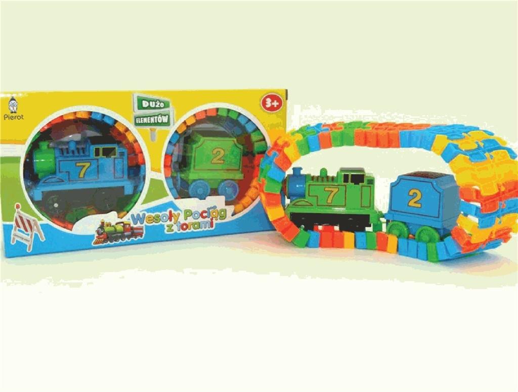 Zestaw składa się z lokomotywy, wagonu i plastikowych torów - 56 elementów.