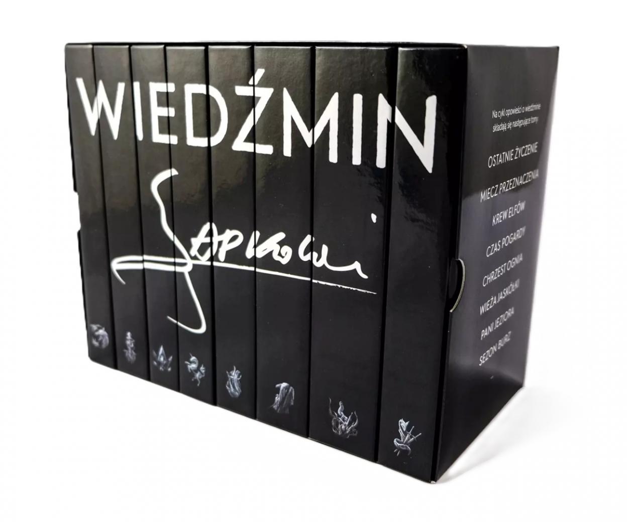 W komplecie: Wiedźmin: Ostatnie życzenie, Miecz przeznaczenia, Sezon burz, Krew elfów, Crzest ognia, Czas pogardy, Wieża Jaskółki, Pani Jeziora.