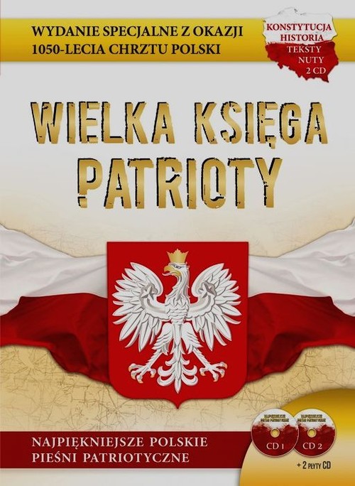 W książce czytelnik odnajdzie wybór poezji patriotycznej. Nie zabrakło tu wzniosłych i nostalgicznych utworów stworzonych przez wieszczów narodowych Adama Mickiewicza, Juliusza Słowackiego, Cypriana Kamila Norwida, jak również wierszy odważnych i pełnych tragizmu powstania warszawskiego autorstwa np. Krzysztofa Kamila Baczyńskiego. Książka wzbogacona została o przystępny słownik pojęć patriotycznych oraz poczet patriotów polskich, w którym zostały ukazane sylwetki bohaterów narodowych, zarówno tych powszechnie znanych, jak i tych, o których historia rzadziej wspomina. Do książki dołączyliśmy tekst Konstytucji Rzeczypospolitej Polskiej. ""Wielka księga patriotyczna to publikacja, która promuje polską kulturę. Znajomość dziedzictwa narodowego, a takim bez wątpienia są pieśni patriotyczne, pozwala budować tożsamość każdego Polaka, sprzyja kształtowaniu postaw obywatelskich oraz poczuciu więzi społecznej i solidarności. Wielkim atutem książki jest szata graficzna. Publikacja została zilustrowana obrazami i zdjęciami, które nawiązują do najważniejszych i najbardziej wzruszających momentów z dziejów Polski. Każdy Polak odnajdzie w niej natchnienie i pozytywne emocje. Do książki zostały dołączone 2 płyty audio CD pt. Najpiękniejsze pieśni patriotyczne. Piosenki w wykonaniu chóru Polish Chamber Voices zostały nagrane w niezwykłym miejscu, jakim jest kaplica św. Józefa na Halach przy Jasnej Górze w Częstochowie. x
