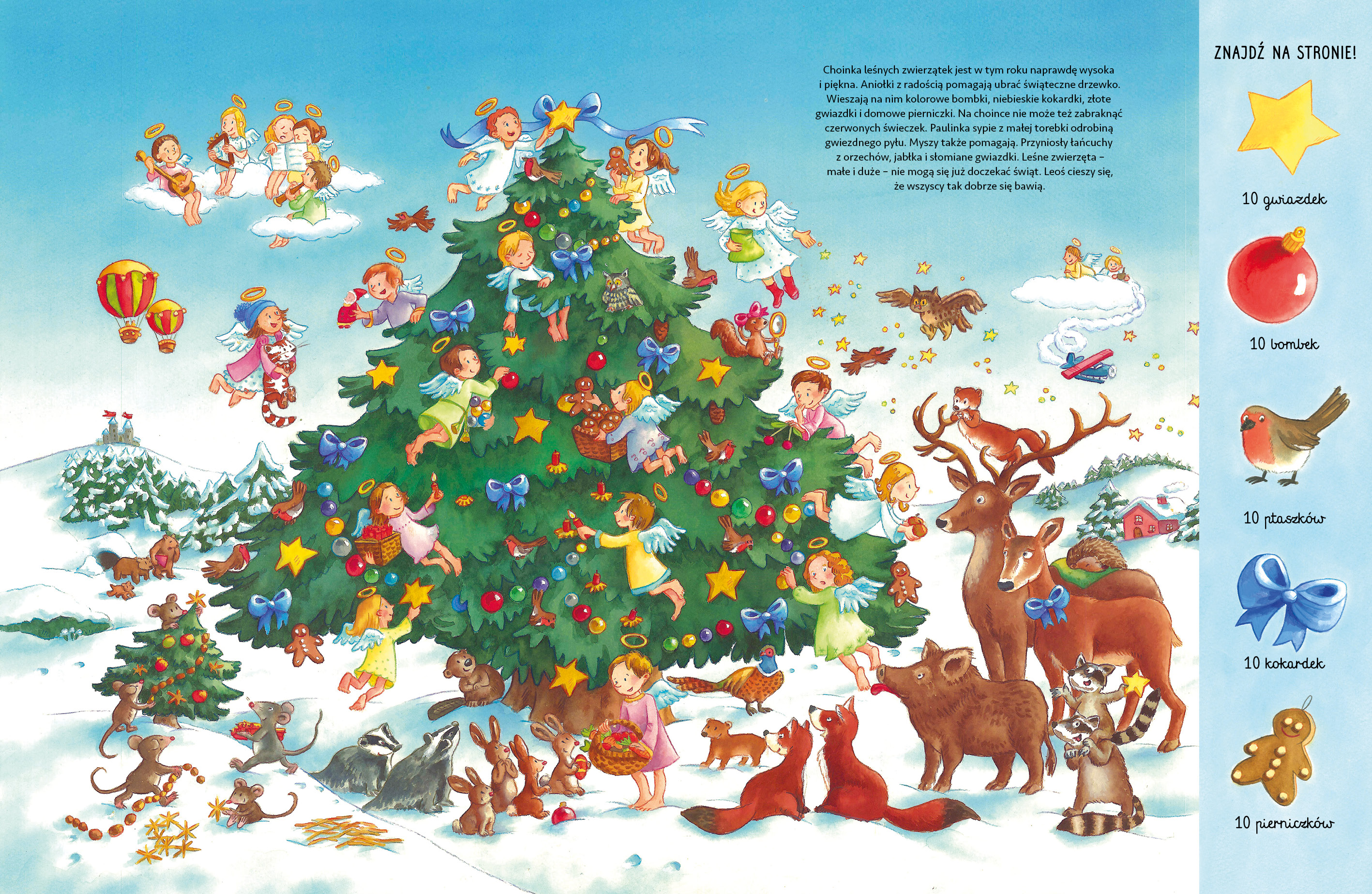 Także na dalekiej północy, pośród śnieżnych zasp, dwa małe aniołki mają ręce pełne roboty. Mimo wszechobecnego chłodu dzielnie odbierają kolejne dziecięce listy i doręczają je wprost do warsztatu Świętego Mikołaja. Czy skrzaty wyprodukowały wystarczającą ilość lalek, sanek i klocków? Paulinka i Leoś zaglądają do świątecznej kuchni, gdzie trwa wielka produkcja pierniczków, pomagają także leśnym mieszkańcom dekorować wysoką choinkę. Czy zdołają na czas obudzić Świętego Mikołaja? Gdzie się podział jego czerwony strój? Możecie pomóc Paulinie i Leosiowi w świątecznych poszukiwaniach zaginionych przedmiotów! "Wielka świąteczna wyszukiwanka" Carolin Görtler od Wydawnictwa Znak to propozycja dedykowana najmłodszym czytelnikom. Na sześciu rozkładówkach ukryto aż 170 przedmiotów. Czy uda Wam się odszukać wszystkie? Ta sztywnostronicowa książeczka, pełna jest barwnych i bogatych w detale ilustracji. Wyszukiwanie poszczególnych elementów staje się dobrym treningiem koncentracji i spostrzegawczości. Doskonali umiejętność liczenia, wspiera rozwój mowy m.in. poprzez utrwalanie nazewnictwa. Zawsze jestem na tak dla publikacji, które bawią i uczą. Polecam serdecznie najmłodszym! x