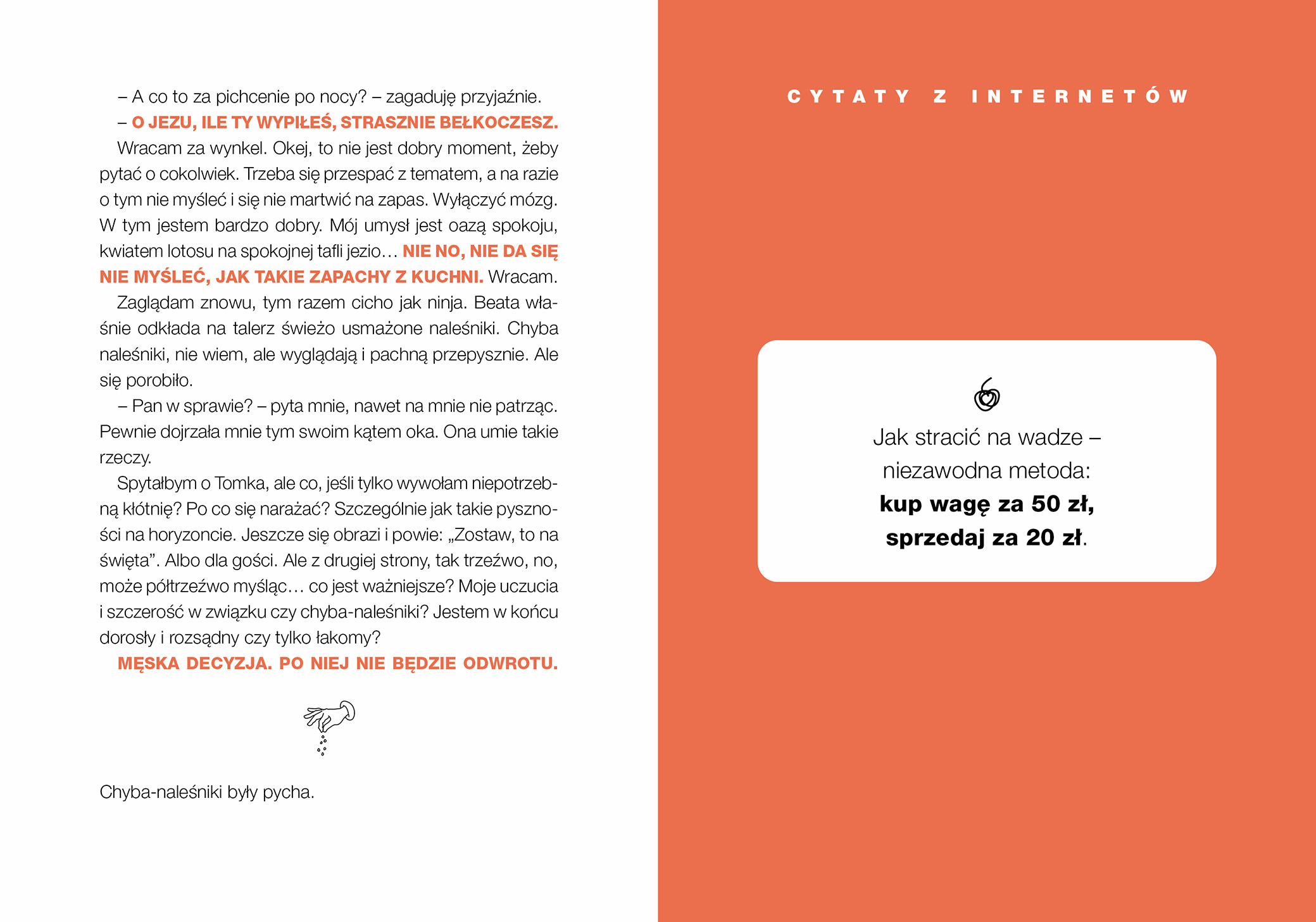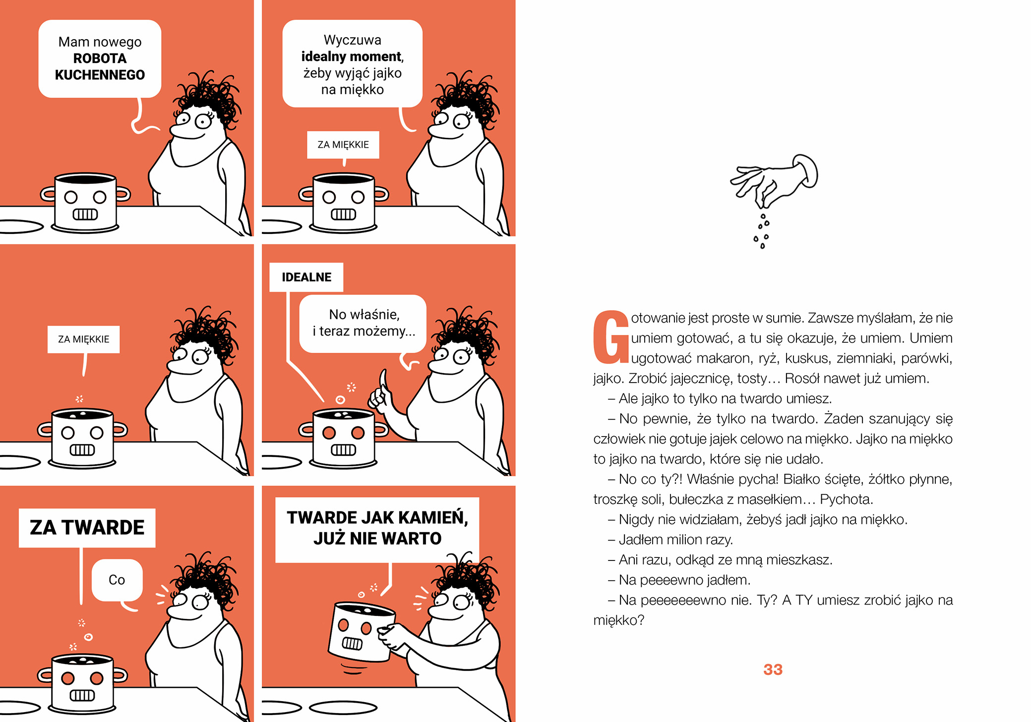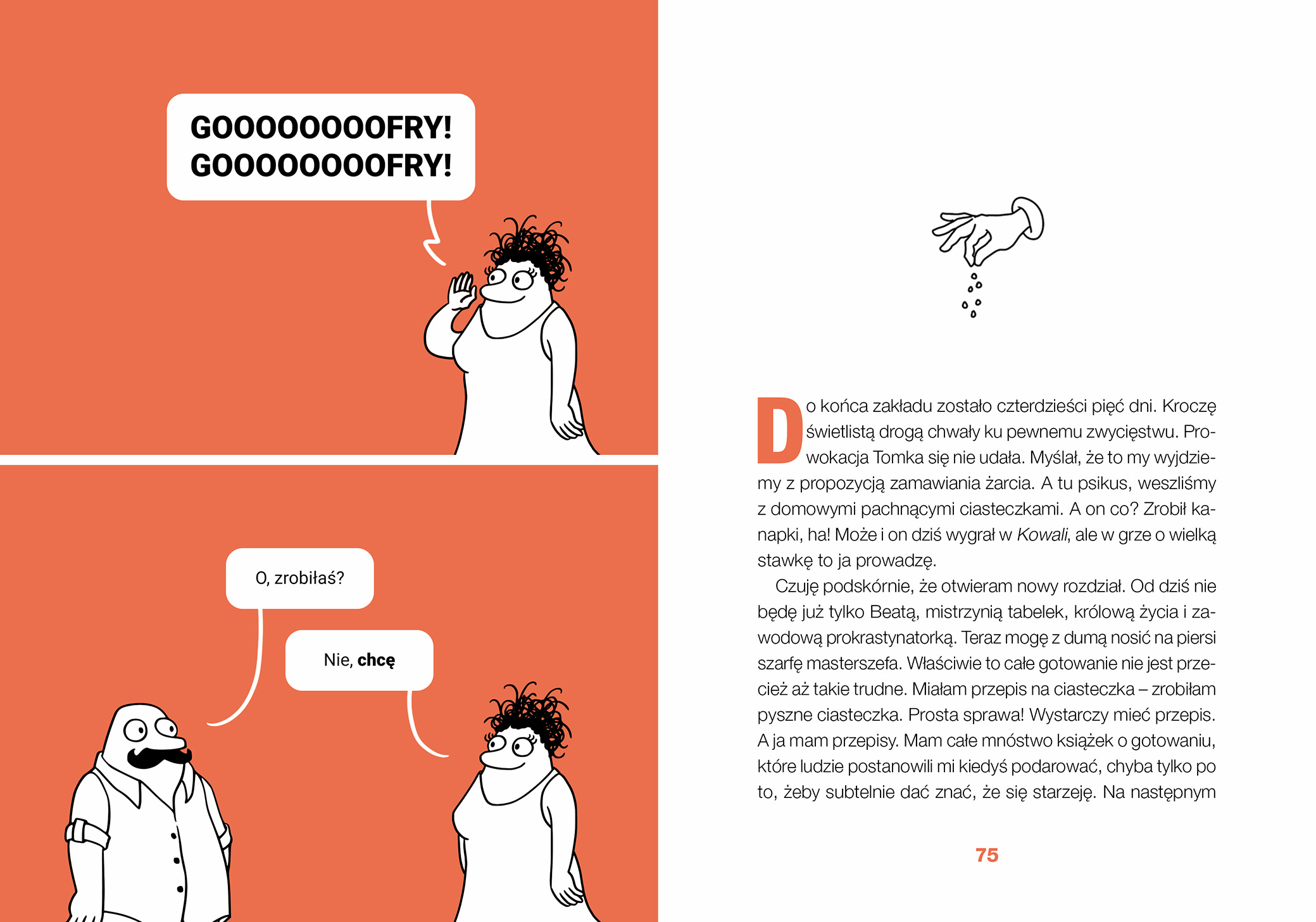 Uff, na początku myślałem, że się z tą książką wpakowałem. Jak już zaczynam czytać jakąś książkę to z założeniem, że ją skończę. Tym razem początek jakoś do mnie nie przemówił. Może nie miałem dnia. Jednak jak zaczynam to chcę skończyć i zostałem nagrodzony za nierezygnowanie mimo początkowego nie najlepszego wejścia w książkę. Rozkręciło się i to naprawdę dobrze. Zaczęła się dobra zabawa z humorem, dystansem bohaterów do siebie i wzajemnych relacji w związku. Książka kręci się wokół gotowania, ale przy okazji widać jak w zwierciadle jak teraz funkcjonujemy w kwestiach żywienia jako przeciętni ludzie i albo idziemy w tej kwestii na łatwiznę, albo musimy mieć dobrą motywację by tym tematem zacząć się zajmować trochę bardziej na poważnie i wysilić się przy przygotowywaniu posiłków. Współczesny świat chętnie, za pieniądze w tej kwestii nas wyręczy, tylko jak się okazuje tak wiele przez to możemy stracić. Gotowanie, nasze własne, może być interesujące, wciągające w ten proces innych, a przede wszystkim zdrowsze niż jedzenie na mieście lub zamawianie wszystkiego na telefon. Jest przy tym okazja na odkrywanie nowych potraw, odkrywanie siebie i ludzi będących obok nas. Przygody kulinarne opisane w książce to dobra zabawa i czasem trochę widziałem siebie przy nieporadności w kuchni jaką opisywała bohaterka. Bo gotować trzeba się uczyć, z tym się nie rodzimy, warto się rozwinąć w tym aspekcie. Książka, a jakże jest o gotowaniu, ale przede wszystkim to świetna rozrywka, którą polecam. A i są przepisy, wiele bardzo interesujących i inspirujących, czasem z ciekawą nazwą, czasem z ciekawymi składnikami, czasem prawie z niczego, ale na pewno da się je wykorzystać. Przymierzam się do skorzystania z kilku. Muszę więc kończyć bo idę gotować.