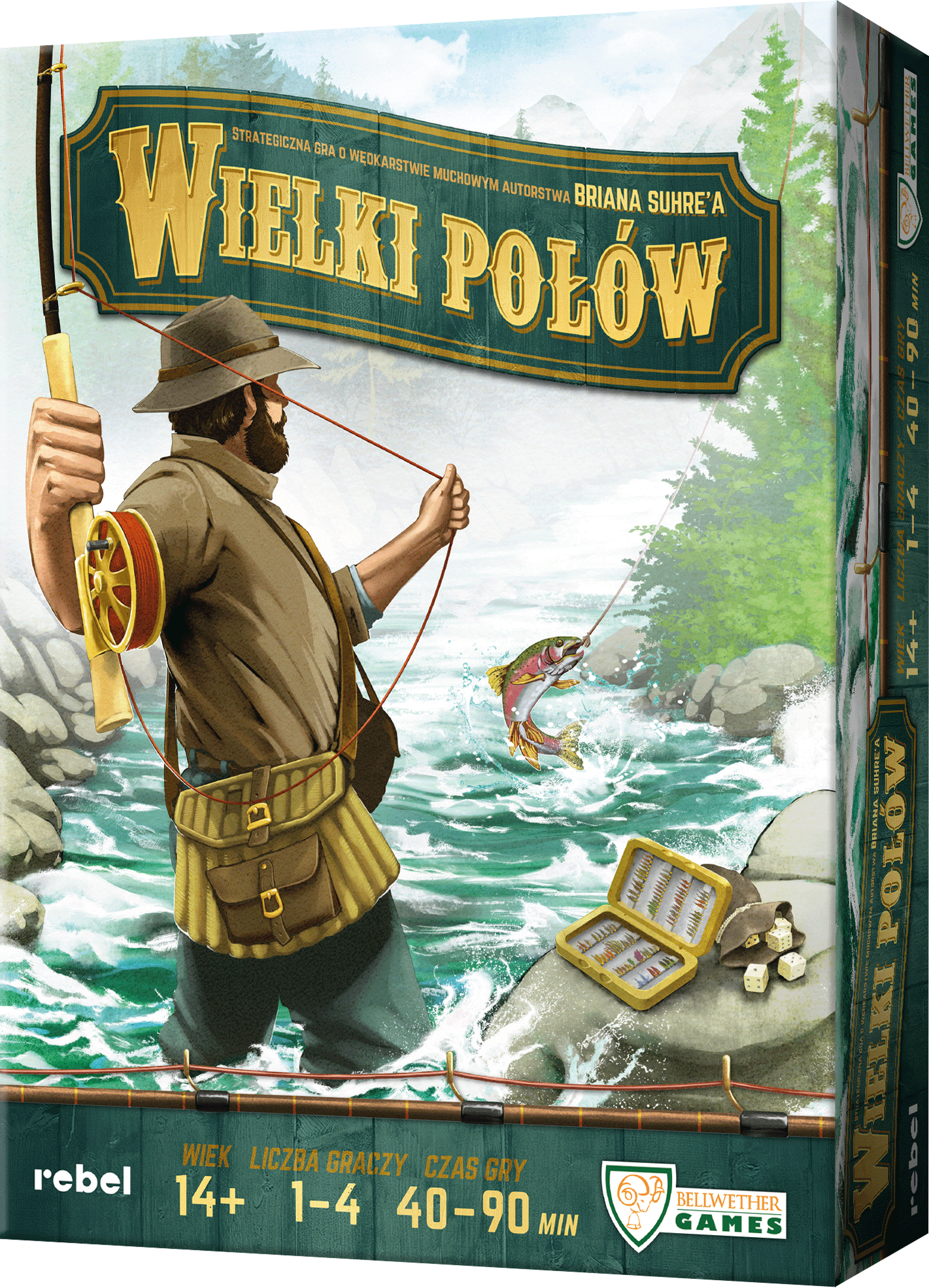 Zmierz się z wartką rzeką, w której aż roi się od ryb. Do dyspozycji masz jedynie wędkę, kołowrotek i zestaw much. Czy uda Ci się zapanować nad prądem rzecznym, celnie zarzucić wędkę, spławić muchę i zwinąć linkę we właściwym momencie? Wielki połów to klimatyczna gra z popularną mechaniką push your luck polegającą na dobieraniu kości i korzystaniu z akcji na planszy kołowrotka. Choć zasady gry są proste (w swojej turze gracz wybiera kość i wykonuje 1 akcję), to zwycięstwo wymaga ułożenia przemyślanej strategii i korzystania z dodatkowych możliwości. Rozważnie planuj swoje tury i łącz akcje w niespodziewane kombinacje, a wysuniesz się na prowadzenie! Czy jesteś gotów wykazać się wędkarską finezją i zdobyć najbardziej ambitne osiągnięcia? Na czym to polega? Wielki połów to gra z mechaniką dobierania kości, którą rozgrywa się na przestrzeni kilku rund. W każdej turze gracz dobiera kość z puli i wykonuje akcję: zarzuca wędkę, holuje rybę albo zwiększa swój poziom finezji. Wybór akcji jest bardzo ważny! Dzięki kościom o wysokich wartościach można rozgrywać silniejsze akcje, natomiast dzięki kościom o niskich wartościach zdobywać dodatkowe tury. Gdy w puli nie będzie już kości, za pomocą rzutu tworzy się nową pulę, a gracz, który miał najmniejszą sumę oczek na swoich kościach w poprzedniej rundzie, rozpoczyna kolejną. Gra się kończy, gdy 1 z graczy złowi 7. rybę. Należy przyznać punkty za osiągnięcia i wyłonić zwycięzcę. Liczba graczy: 1 - 4 osoby Czas gry: ok. 40-90 minut x