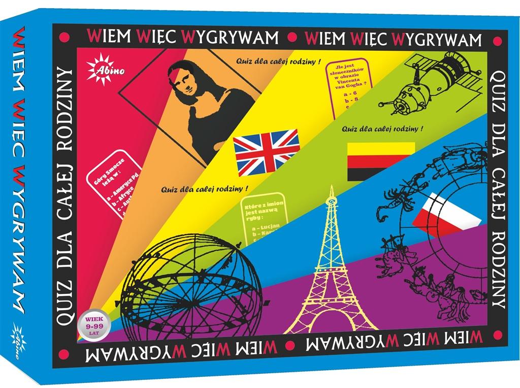 WIEM WIĘC WYGRYWAM to planszowa gra quizowa dla całej rodziny. Ponad 150 kart z pytaniami z 5 dziedzin, zadania specjalne i dużo emocji.