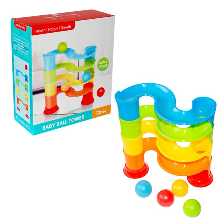 Idealna zabawka dla malucha. Dziecko na najwyższym poziomie toru kładzie kolorową piłeczkę i patrzy jak piłka toczy się po niższych poziomach. Zabawka pobudza ciekawość dziecka i daje dużo radości w łapaniu spadających piłeczek. tor 28x10x28 cm, 4 poziomy, 4 piłeczki. Wiek: 12m+ Wymiary opakowania: 24.5x11x28 cm
