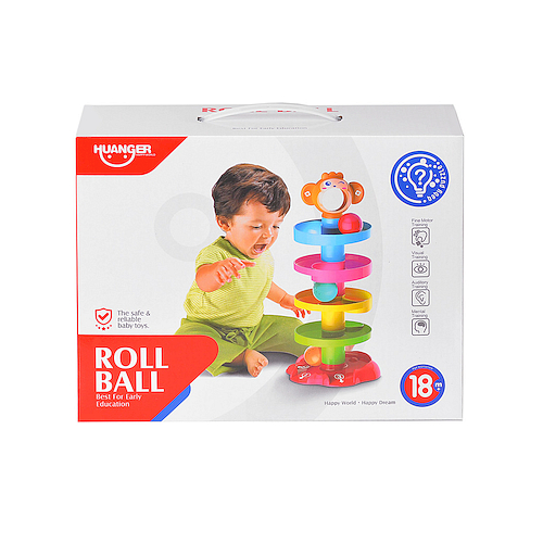 Wieża-małpka z piłeczkami do zabawy dla maluszka. Dziecko chwyta jedną z trzech kolorowych, grzechoczących piłeczek, a następnie wrzuca je do buzi małpki; piłeczka toczy się na sam dół wieży i wypada jednym z trzech wyjść. Na które trafi tym razem? Niespodzianka!