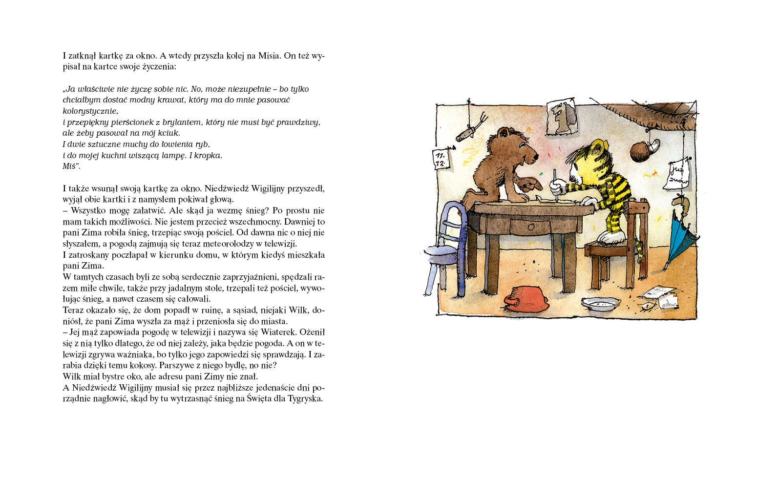 Dwadzieścia cztery historyjki na święta Bożego Narodzenia - po jednej na każdy dzień aż do Wigilii. Wigilijny Niedźwiedź wędruje przez świat i zbiera od wszystkich życzenia, by obdarować każdego wymarzonym prezentem. W lesie przy żłóbku spotykają się znane z poprzednich książeczek postaci: mały Tygrysek, wielki Niedźwiedź, Maja Papaja, Kacperek Gadułka i inni. Wszyscy z biciem serca czekają, co przyniesie im Wigilijny Niedźwiedź i czy spełnią się ich wielkie marzenia.