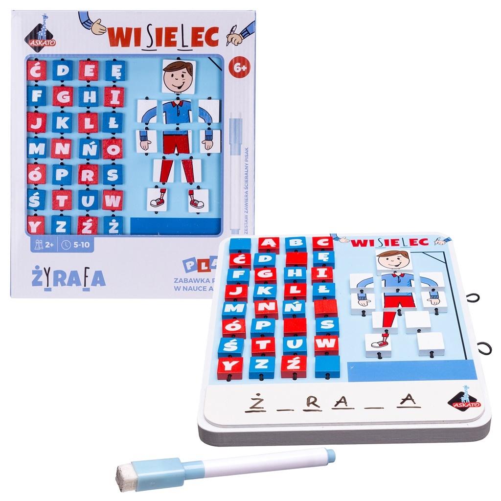 Opis produktuZasady bezpieczeństwaWisielec to gra słowna, czyli nauka poprzez zabawę, dzięki której można poszerzyć wiedzę z różnych dziedzin. Jest ona zarówno świetną rozrywką, jak i sposobem na rozwój intelektualny. Ćwiczy koncentrację, umiejętność logicznego myślenia i spostrzegawczość. Jest to również najefektywniejsza metoda przyswajania ortografii. Zabawka wykonana z drewna.Wiek: 6+Wymiary opakowania: 22.5x3x26 cm x
