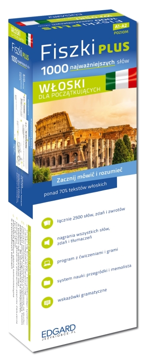 Zawartość: 1000 fiszek + CD-ROM z programem i nagraniami MP3 + Kolorowe przegródki + etuiDlaczego Fiszki Plus?- uczysz się, korzystając z kompleksowego systemu o doskonałej jakości merytorycznej- ćwiczysz wymowę i trenujesz rozumienie ze słuchu tworzysz playlisty nagrań, które odpowiadają Twoim potrzebom - do wykorzystania na komputerze, w telefonie lub odtwarzaczu mp3- powtarzasz aktywnie z programem poprzez ?wiczenia i gry językowe- poznajesz gotowe wzorce komunikacyjne w przykładowych zdaniachCzy wiesz, ze 1000 słów wystarczy, by czytać ze zrozumieniem 70% tekstów użytkowych w języku obcym? Fiszki Plus to kompleksowy system nauki - poznasz z nim ponad 1000 najważniejszych słów, a także wzory odmian, formy nieregularne oraz poprawna wymowę. Przykładowe zdania do KAŻDEGO słówka to gotowe wzorce komunikacyjne, dzięki którym przećwiczysz ich użycie w kontekście. System Fiszki Plus pozwoli Ci szybko opanować podstawy i umożliwi swobodne porozumiewanie się w języku włoskim.- Ucz się słów i przykładowych zdań - poznaj użycie słów w kontekście. Opanuj synonimy, idiomy; poznaj reguły gramatyczne.- Zapamiętuj skutecznie, wykorzystując system z kolorowymi przegródkami.- Poznaj prawidłowa wymowę. Słuchaj nagrań wszystkich słówek i zdań wraz z tłumaczeniami.- Utrwalaj materiał z ćwiczeniami i grami językowymi zawartymi w programie.- Powtarzaj słówka umieszczone na memoliście i sprawdź, co już umiesz.- Ucz się mobilnie - w drodze do pracy lub szkoły!